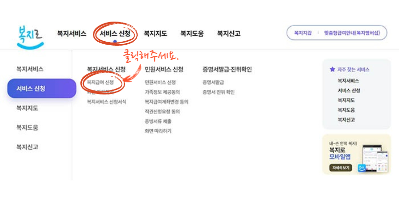 ▶ 로그인 후 상단의 서비스 신청 메뉴를 클릭하면 아래 복지급여 신청메뉴가 나옵니다. 복지로 사이트의 복지급여 신청을 클릭합니다.