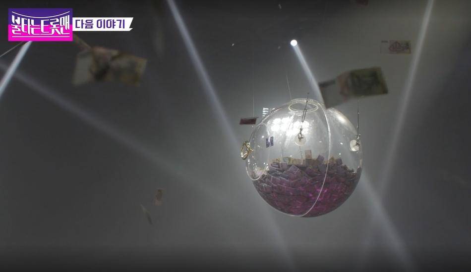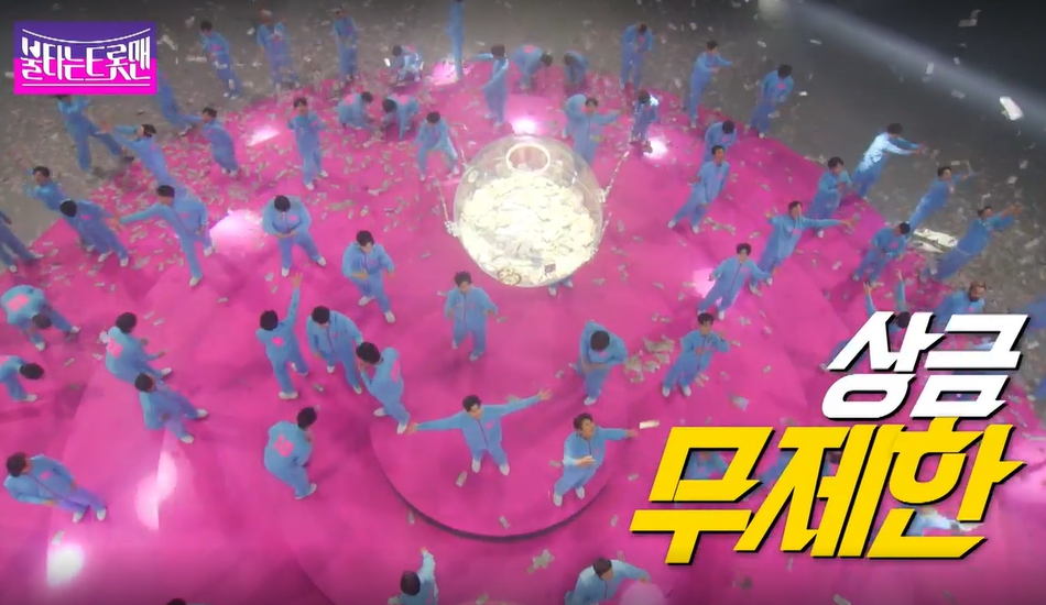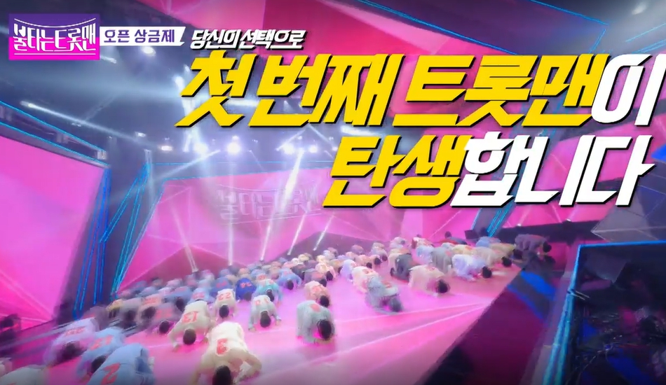 불타는 트롯맨 오프닝은 인기 드라마 '오징어 게임'을 패러디한 느낌이 많이 났는데요. 상금이 담겨져 있는 둥근 투명통이 무대 한 가운데 매달려 있고 그 안에 상금으로 보이는 현금들이 잔뜩 들어있네요. 바라보는 100명의 '불타는 트롯맨' 참가자들의 모습이 간절해 보입니다. '불타는 트롯맨' 오프닝 부터 MBN에서 신경을 많이 쓴 티가 나는 무대였던 것 같네요.