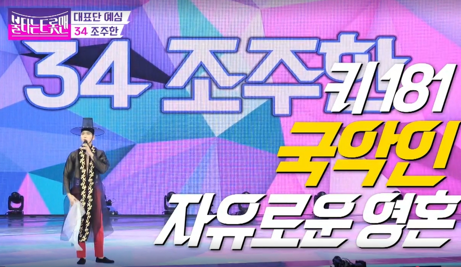 그리고 혼자서 북치고 장구 치고 다하는 참가자 34번 조주한이 등장합니다. 옷차림새며 말하는 추임새가 국악인의 모습이었는데 트로트도 잘 소화해 내고 무대를 꽉 차게 만드는 묘한 재주가 있어 '불타는 트롯맨' 심사위원들과 국민대표단의 마음을 사로 잡아 올인으로 본선에 진출합니다.