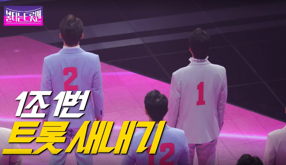 이번 '불타는 트롯맨'의 조편성은 독특했지만 합리적이었다고 생각이 들었어요. 바로 트로트 경력에 따라 번호를 주었다고 해요. 1조의 1번이 가장 트로트의 시작점에 있는 참가자이고 10조에 참가한 이들은 경력이 30년이 넘은 분들도 계시더라구요. 그래서인지 홍진영이나 박현빈 등은 참가자들 중에  꽤 알고 있는 분들이 있는 눈치 였어요. 번호만 들어도 참가자의 경력을 알 수 있으니까 의미 없는 번호보다는 보는 시청자들도 '불타는 트롯맨'의 참가자를 평가할 수 있는 기준이 되는 것 같아서 개인적으로 참 마음에 드는 방식이었어요. 그렇게 간단하게 모든 참가자들을 한번 모여준 다음에 드디어 무대가 시작됩니다.